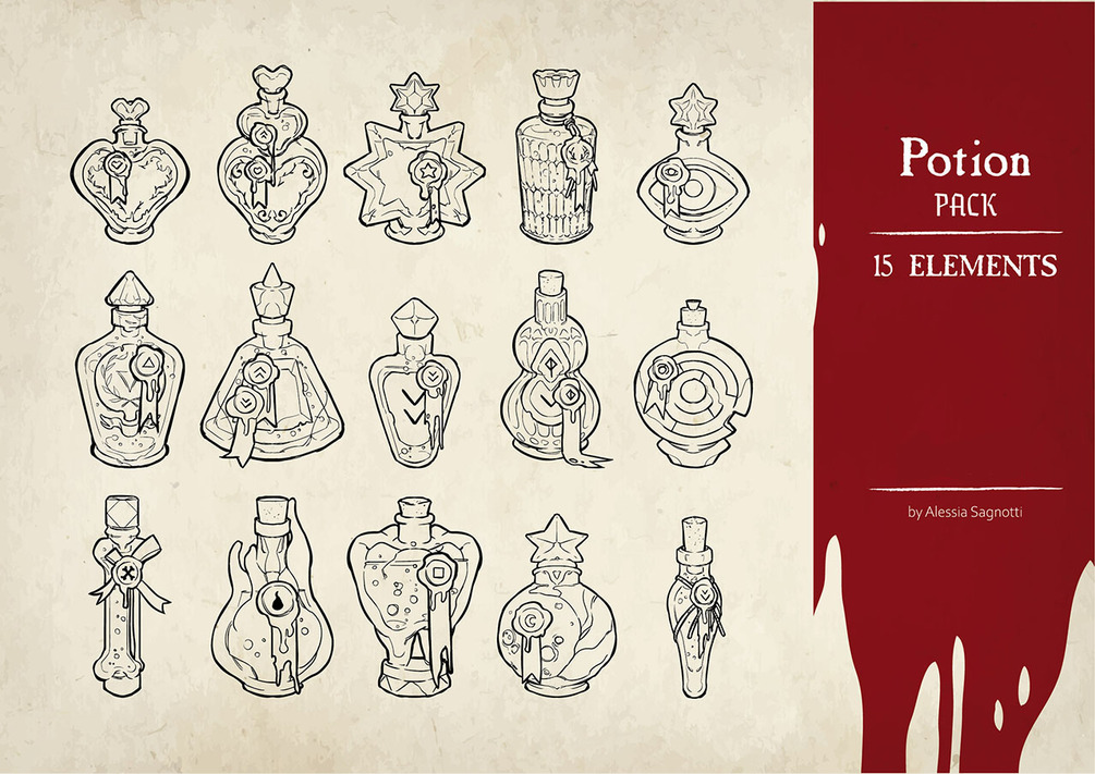 "Potion Pack" is a set of elements in clean lineart, hand-drawn, original, and with 15 elements made to give personality to any of your projects.
